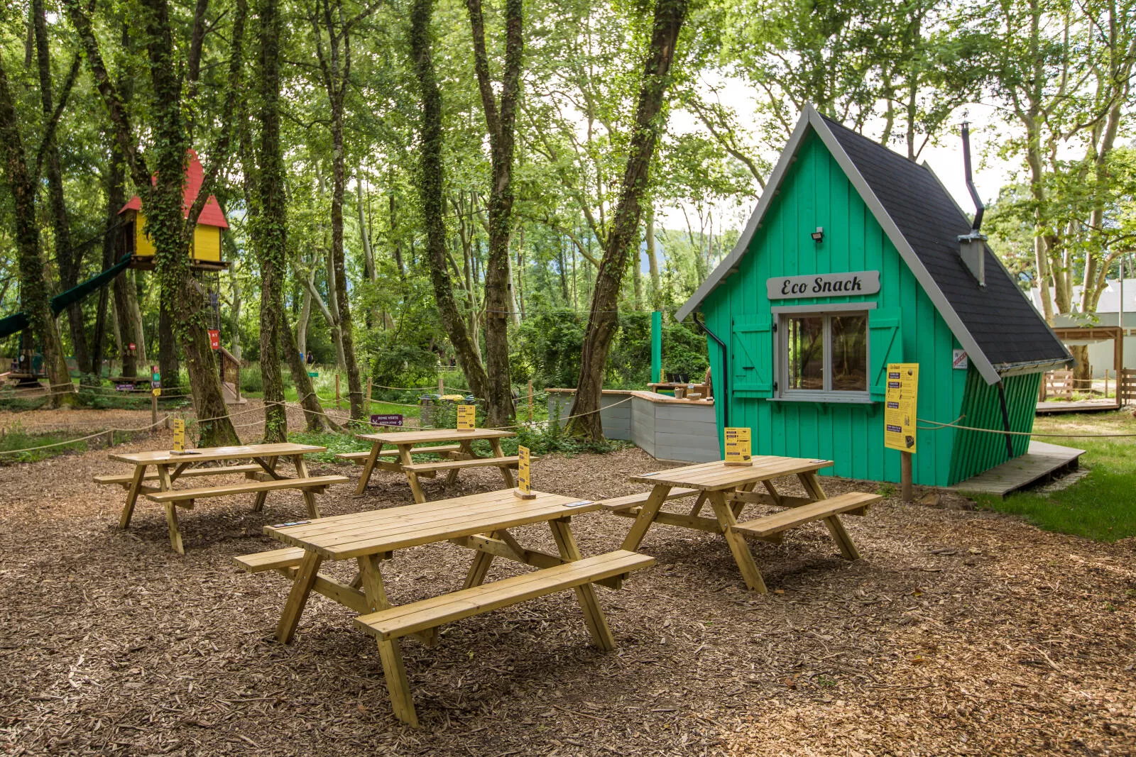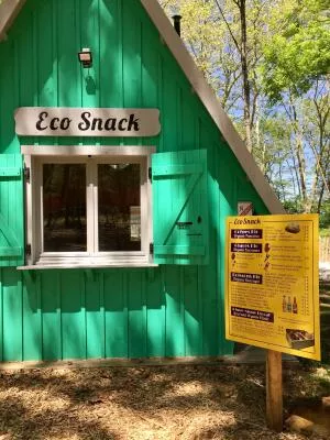 Pour une pause gourmande, aussi bien pour les petits que les grands, nous vous donnons rendez-vous à l'Eco-Snack ! Vous ne pourrez pas passer à côté de cette grande cabane construite par nos mains située à l'entrée du parc.